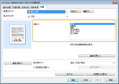 [对象] | 选择适合文档类型或打印用途的选项。例如,针对一般用途选择 [常规],或在要打印最佳打印质量的照片图像时选择 [生动的照片]。 [常规]: | 适用于打印大多数文档的多功能选项。 | [印刷品]: | 适用于打印同时含有照片图像、图表和图形的文档。 | [图形]: | 适用于打印同时含有图表或图形的文档。 | [生动的照片]: | 适用于打印照片图像。 | [设计 [CAD]]: | 适用于打印含有许多细线的设计图纸。 | [红头专色]: | 适用于打印特定红色阴影。 |