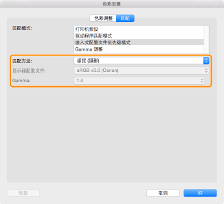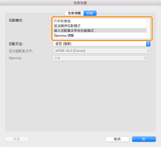 [匹配模式] | 设置处理色彩校正的方法。 [打印机预设]: | 使用打印机默认设置。 | [驱动程序匹配模式]: | 执行打印机驱动程序(计算机)匹配处理。 | [嵌入式配置文件优先级模式]: | 使用打印图像中嵌入的色彩配置文件执行色彩处理。 | [Gamma 调整]: | 要设置 Gamma 调整,请选择该项目并使用 [Gamma 调整] 设置 Gamma 校正值。 |