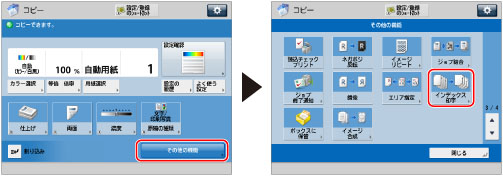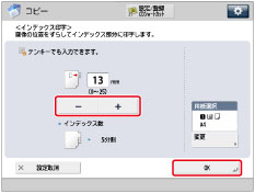 タッチパネルディスプレーに表示されているインデックス数と、セットされているインデックス紙のインデックス数が合っているか確認してください。 セットされているインデックス紙の分割数の変更は、[用紙の設定]で行います。(→給紙箇所にセットした用紙のサイズと種類を登録する) |