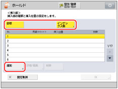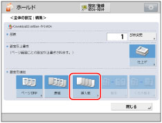 設定内容を選択してから[詳細/編集]を押して、挿入する合紙、インデックス紙の設定を確認/変更できます。 挿入紙を削除するときは、削除したい設定内容を選択してから[削除]を押します。 [インデックス紙]を選択した場合は、タッチパネルディスプレーに表示されているインデックス紙と給紙箇所にセットされているインデックス紙のインデックス数が合っているか確認してください。 |