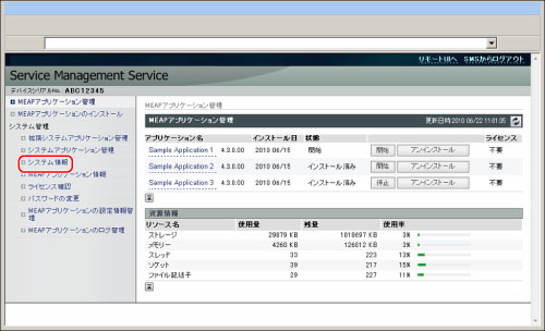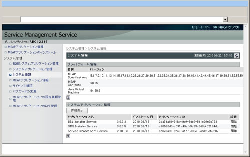 Java Virtual Machineなどのプラットフォームに関するバージョン情報や、システムアプリケーションのバージョン情報、インストール日、状態などを確認できます。