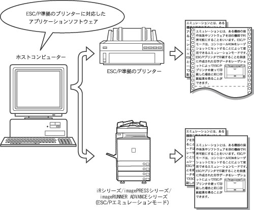 iRシリーズ/imagePRESSシリーズ/imageRUNNER ADVANCEシリーズの動作モードがESC/Pエミュレーションモードに切り替わることによって、ESC/P準拠のプリンター(以降「ESC/Pプリンター」と呼びます)を使って印字したときと同等の印字を行うことができます。