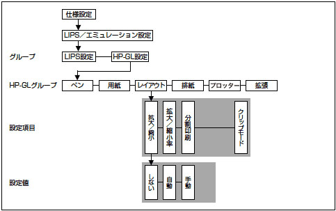 HP-GLエミュレーションモードの印刷環境の設定項目や設定値は、この中のHP-GLグループに含まれています。「HP-GL設定」というグループ階層を選択すると、HP-GLエミュレーションモード専用の6種類のメニューグループが表示されます。