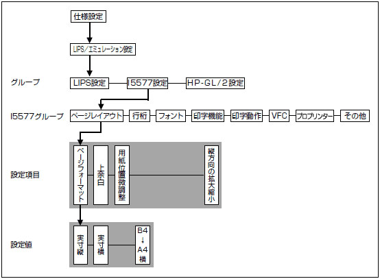 I5577エミュレーションモードの印字環境の設定項目や設定値は、この中のI5577グループに含まれています。「I5577設定」というグループ階層を選択すると、I5577エミュレーションモード専用の8種類のメニューグループが表示されます。