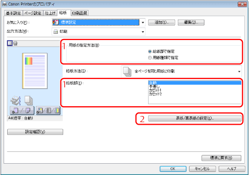 特定の用紙に印刷したい場合、その用紙がセットされている給紙部、またはその用紙種類を指定します。