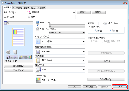 プリンタードライバー画面の[ヘルプ]をクリックすると、ヘルプが表示されます。