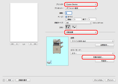 お使いのプリンター→[印刷品質]を選択→[色数の設定]をクリック