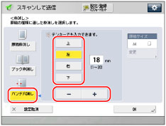 [パンチ穴消し]を押す→パンチ穴の位置を指定→[-][+]を押して枠消しする幅を設定