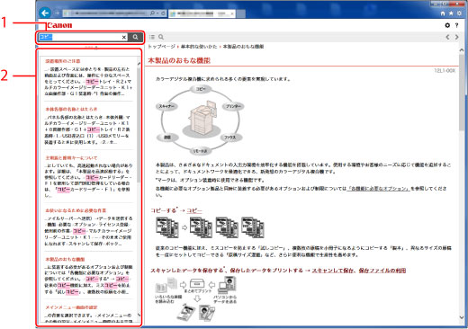 1. | キーワードを入力 を押して表示される入力欄に文字を入力して、 をクリックすると、検索結果が表示されます。また、2つ以上の語句を入力して検索結果を絞り込むこともできます(AND検索)。その場合、語句と語句の間にはスペースを入れてください。 例:「トナー メッセージ」(「トナー」と「メッセージ」の両方の語句が含まれるページを表示させたいとき) ダブルクォーテーション("")で語句を括ると、フレーズ検索になります。 |