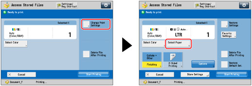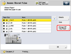 You can register paper types that are not displayed on the detailed settings list in <Change Multi-Purpose Tray Paper: Paper Type>. For more information on storing the paper type, see "Registering Custom Paper Types."If there is more than one reserved job waiting to print, only the last paper size/type specified for the reserved print job appear on the Paper Select screen. |