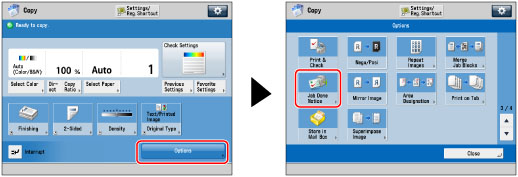 To be able to set [Job Done Notice], you must first store your e-mail address in the Address Book. (See "Registering an E-Mail Address.") |