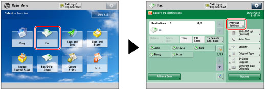 You can store a series of destination, scan, or send settings specified before pressing (Start) as a single group of Previous Settings.If you set [Manage Address Book Access Numbers] to 'On', you cannot recall settings from memory. (See "Managing the Address Book with Access Numbers.") If you set any address type to 'On' in [Limit New Destination], the currently stored Previous Settings are deleted. (See "Restricting Sending to New Addresses.") |