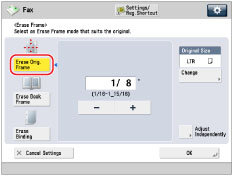 This mode enables you to remove the shadows and lines that appear when scanning various types of originals. There are three types of Erase Frame: [Erase Orig. Frame], [Erase Book Frame], and [Erase Binding].