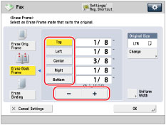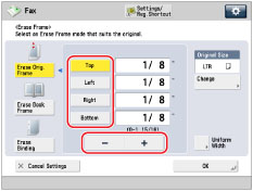 Press [Center] and [Sides] → press [-] or [+] to set their respective Erase Frame widths.