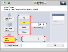 Press [Erase Binding] → specify the location of the binding marks → press [-] or [+] to set the erase frame width.