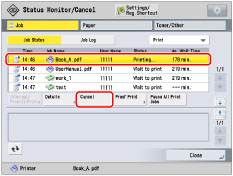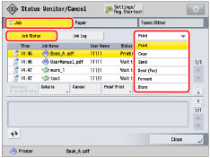Press [Job] → [Job Status] → select [Print] from the drop-down list.