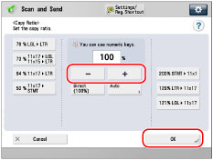 If you set PDF (Trace & Smooth), PDF (Compact), PDF (OCR), XPS (Compact), XPS (OCR), or OOXML as the file format, you can only send at a zoom ratio of [Direct (100%)] or [Auto].