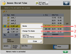 For information on the types of icons displayed for memory media, see "Types of Memory Media Icons." For the procedure regarding [Add Files (Scan and Store)] and instructions on operating the Scan screen, see "Adding a File (Scan and Store)" and "Flow of Scan and Store Operations." |