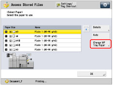 You can register paper types that are not displayed on the detailed settings list in <Change Multi-Purpose Tray Paper: Paper Type>. For more information on storing the paper type, see "Registering Custom Paper Types."If there is more than one reserved job waiting to print, only the last paper size/type specified for the reserved print job appear on the Paper Select screen. |