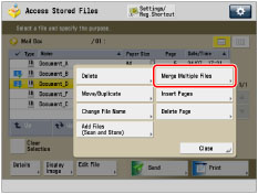 If you create a file without assigning it a name, the machine automatically assigns the file a name using the year, month, day, and time the file was created. For example, if a merged file is created at 1:35 PM, 41 seconds, on January 15, 2016, its name will be <20160115133541>. If print settings have been stored for the selected files, the settings are not carried over to the new file. |