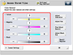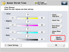 Specify the color balance, saturation, hue, and density settings that you want to store → press [Recall/Register].