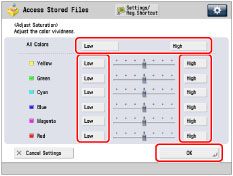 Press [Low] or [High] to adjust the saturation level of the selected color or all the colors → press [OK].