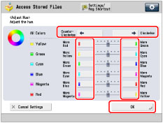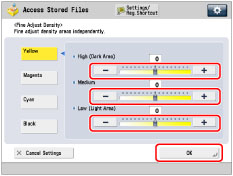 Select the color that you want to adjust → press [-] or [+] to adjust the density level for the darker (high), medium, and lighter (low) density areas → press [OK].