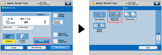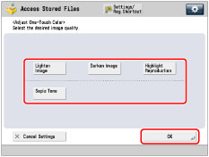 Adjust One-Touch Color mode settings are actually preset color balance settings. Therefore, if you change the Adjust One-Touch Color mode settings, any color balance settings that you may have made are also changed. You cannot set the Sepia Tone mode to files in a mail box that have been received from a computer. If you press [Start Printing] with the Sepia Tone mode set, a message prompting you to reset the settings appears on the screen. You cannot specify Adjust One-Touch Color mode settings when you print a CMYK format file stored in a mail box. |
