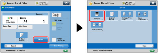 This mode is only available for printing files stored in the memory media. You can use this mode only when printing JPEG, TIFF, or PDF files. |