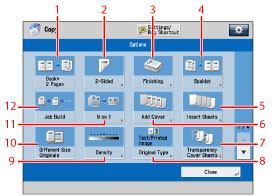 10 | Shortcuts to [Options] Press to select an option mode. [Finishing], [2-Sided], [Density], and [Original Type] are set as default. |