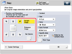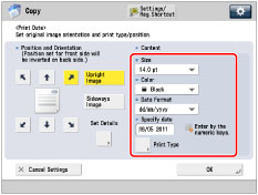 You can also adjust the position of the date. (See "Registering/Editing/Deleting User-Defined Text for Page Numbers and Watermarks.") |