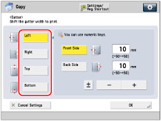 Press [Front Side] or [Back Side] → press [-] or [+] to set their respective gutter width → press [OK].