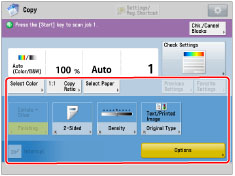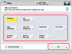 You can change or specify the settings for [Copy Ratio], [2-Sided Original], [Density], and [Original Type] before scanning the next batch of originals (i.e., between batches). To change the settings, press [Change Settings]. Select the mode to change → after pressing [Change], change the settings → press [OK] → [OK].