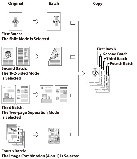 This mode enables you to scan multiple batches of originals with different copy settings and print them as one document.