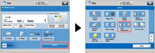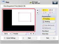 To continue designating other areas, press an area key → repeat step 3. To redesignate an area, select the area by pressing the appropriate area key. To clear a designated area, select the area by pressing the appropriate area key → press [Clear Area]. If you want to use different settings for different areas, select the area by pressing the appropriate area key → select [Framing] or [Blanking]. |