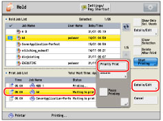 Select the desired job from the Print Job List → press [Details/Edit] → [Priority Print].