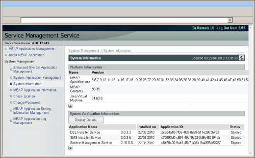 You can confirm version data relating to platforms (such as Java Virtual Machine), and version data, date of installation, current status, etc. of system applications.