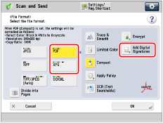 You can only add device signatures to PDF or XPS documents if you have generated a device signature certificate and key pair. (See "Digital Signatures.") The following conditions are necessary to add a user signature to a PDF file: SSO-H login service must be set for the machine A user certificate must be installed in the machine using the Remote UI (See "Installing a Certificate File.") |