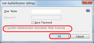 Before scanning, a dialog box for verifying authentication information may be displayed. Enter the department ID/user name and PIN/password registered in the scanner to begin scanning.