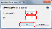 Enter [Department ID] and [PIN] (for user authentication, enter [User Name] and [Password]) → click [OK].