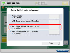 [Regist. Info. for Each User]: | Uses the authentication information registered by each user of an SMTP server. Further settings are required for each user. |