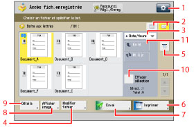 2 | Liste/Vue miniature Pour sélectionner un réglage d'affichage des dossiers et des fichiers mémorisés dans une boîte aux lettres. |