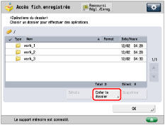 Sélectionner le support mémoire souhaité → sélectionner le niveau de dossier souhaité → appuyer sur [Opérations du dossier].