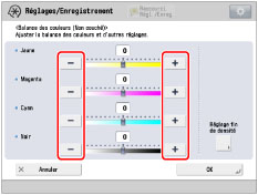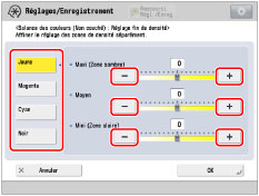Sélectionner la couleur à régler → appuyer sur [-] ou [+] pour régler le niveau de densité des zones sombres (haute densité), moyennes (densité normale) et claires (faible densité).