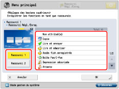 Pour définir les réglages de l'écran Menu principal, se connecter à la machine comme administrateur. Par défaut, les réglages de l'administrateur système (code administrateur système/PIN système) sont définis sur la machine. Par conséquent, l'administrateur doit se connecter en saisissant le numéro d'administrateur système et le PIN système dans l'écran Réglages/Enregistrement. Le réglage par défaut du numéro d'administrateur système et du PIN système est "7654321". Si le nombre de boutons de fonction est supérieur à la valeur définie sous <Réglages affichage bouton menu principal>, les boutons supplémentaires sont affichés sur le deuxième écran du Menu principal. L'écran du Menu principal peut contenir 16 boutons au maximum. Si l'on sélectionne [Afficher tt] dans le Menu principal, tous les boutons sont affichés dans l'ordre par défaut, même lorsque leur disposition a été modifiée. Pour revenir à l'écran personnalisé, appuyer à nouveau sur [Afficher tt]. Pour plus d'informations sur [Changer langue/clavier], voir "Activation/désactivation du changement de langue/clavier". Pour plus d'informations sur [Régl. auto dégradés], [Réglages papier] et [Réglages de gestion du type de papier], voir "Réglage automatique des demi-teintes". "Mémorisation du type et du format de papier d'une source d'alimentation", et "Présentation de cette fonction". Les sauts de ligne utilisés lors de la mémorisation des pages Web sont indiqués dans le nom des boutons de page Web à l'écran Menu principal. |