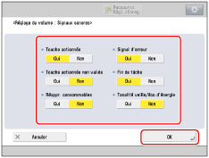 Tonalité veille/éco.d'énergie: | A la mise en mode Économie d'énergie/Veille de la machine. A la mise hors tension de la machine, il faut définir [Réglages démarr. rapide à la mise ss tension] sur "Oui" sous [Préférences] (Réglages/Enregistrement). (Selon les situations, la machine peut ne pas démarrer rapidement et ne pas émettre de son.) |