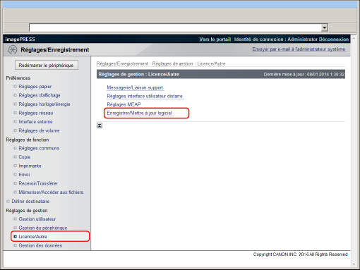 Pour effectuer la procédure décrite dans cette section, il est nécessaire d'être connecté à la machine en tant qu'administrateur. (Voir "Connexion à la machine en tant qu'administrateur".) |