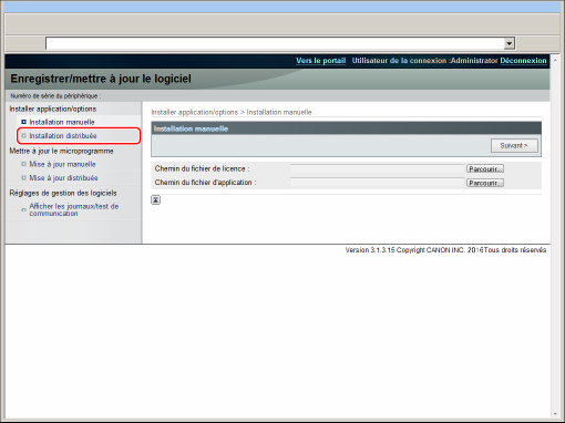 Préparer le certificat du numéro d'accès à la licence inclus dans le module. Pour plus d'informations sur la connexion à un réseau externe, voir "Procédures de configuration de l'environnement réseau". Pour vérifier que la machine peut communiquer correctement avec le serveur de distribution, effectuer un test de communication avant l'installation, le cas échéant. (Voir "Réalisation d'un test de communication avec le serveur de distribution".) |