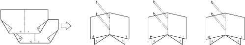Pour utiliser le mode Piqûre à cheval, l'original doit déjà être sous forme de brochure, comme illustré ci-dessus. (Voir "Mode Brochure".) |