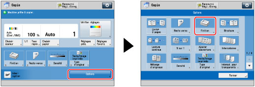 Pour plus d'informations sur les produits en option, voir les rubriques suivantes : Si l'option [Finition] n'est pas réglée, les feuilles sont déposées de la même façon que lorsque l'option [Tri groupé (Pages ident)] est réglée. Si l'option [Tri séquentiel auto.] est réglée sur "Oui", le mode Tri séquentiel ou Tri séquentiel décalé est automatiquement activé lorsque les originaux sont placés dans le chargeur. (Voir "Activation du tri séquentiel automatique".) Il est possible d'afficher les informations détaillées sur le papier sélectionné en appuyant sur [Détails]. |